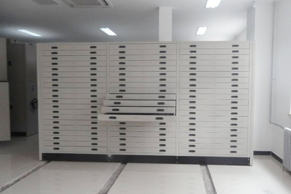 底图密集架是企事业单位,档案馆、图书馆存放各类图纸的专用装具。采用设有特别导轨的滚结构抽屉,存取灵活、轻便;抽屉拉出时能始终保持水平状态,适用于各类型底图平放。