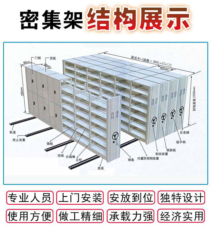 密集柜主要由轨道、底座、立柱(板式)、搁板、挂板、侧靠板、背靠板、顶板、防尘板、护板、门板、传动机构、防倾倒、防震、防尘、防鼠、制动、缓冲、目录卡及传动装置、密封装置组 成: