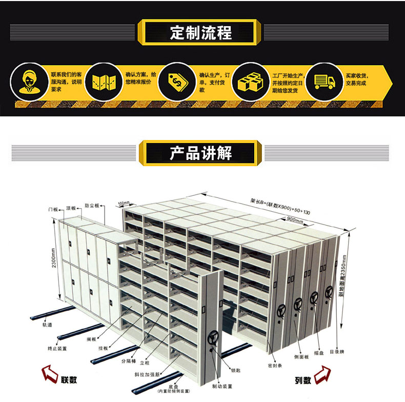 密集密集柜整体结构由底盘、架体、传动机构、防护装置四大部分组成,架体由立柱、面板、挂板、顶板等组成,为可拆装式结构。零部件在生产基地加工组装完成后现场总装调试。各零部件间采用插装、铆接、螺栓紧固方式,安装快捷简便,架体牢固。