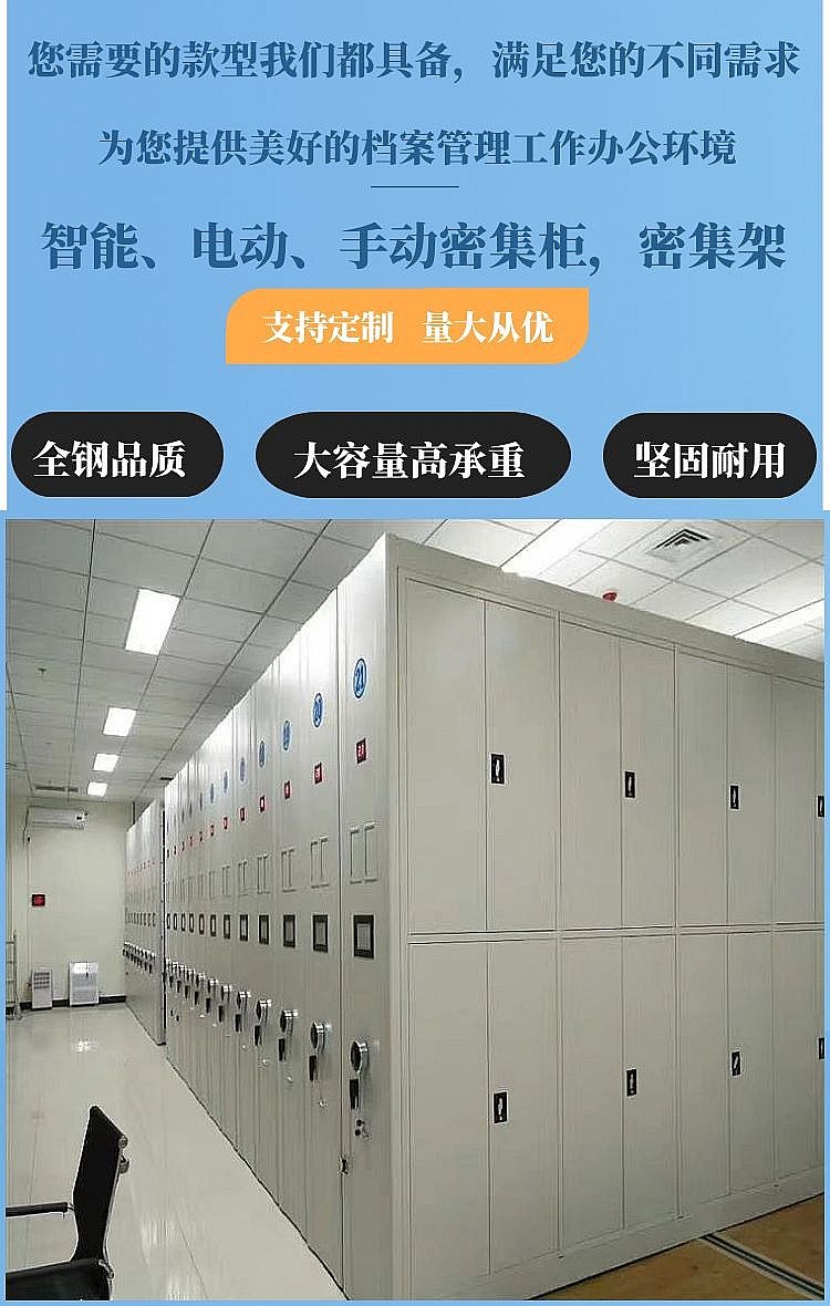 7、样式多,可根据自身需求选用合适的档案密集架。密集架厂家出产有中低档次手动密集架以及电动、智能密集架,无论客户是需求哪种密集架,都能找到合适自己的产品。